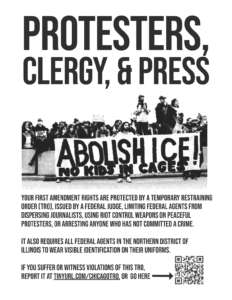 Anyone protesting, observing, or documenting federal actions under “Operation Midway Blitz” in the Northern District of Illinois (including Cook, DuPage, McHenry, Grundy, Kane, Kendall, LaSalle, Lake, Will, Boone, Carroll, DeKalb, Jo Daviess, Lee, Ogle, Stephenson, Whiteside, and Winnebago counties).